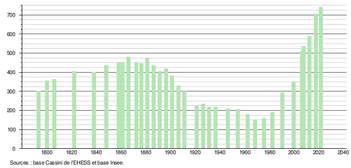 L'évolution du nombre d'habitants est connue à travers les recensements de la population effectués dans la commune depuis 1793. Pour les communes de moins de 10 000 habitants, une enquête de recensement portant sur toute la population est réalisée tous les cinq ans, les populations légales des années intermédiaires étant quant à elles estimées par interpolation ou extrapolation[10]. Pour la commune, le premier recensement exhaustif entrant dans le cadre du nouveau dispositif a été réalisé en 2007[11].