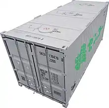 Un conteneur réfrigéré ou conteneur frigorifique[33] est un conteneur capable de maintenir une certaine température quelles que soient les conditions extérieures. Son contrôle est assuré par une transmission de ses paramètres à la passerelle[34]. Le principe du conteneur est basé sur un dispositif de production de froid alimenté en courant par des prises électriques spéciales sur le moyen de transport, le plus souvent des porte-conteneurs. Sauf produits spéciaux nécessitant de l'air extérieur, seul l'air intérieur est refroidi via un moteur à l'arrière du conteneur. Cet air circule ensuite par le plancher pour se propager dans tout le conteneur uniformément puis remonte vers le haut du conteneur. Une fois arrivé en haut, l'air est capté par le moteur puis refroidi et réinjecté dans le système[35].