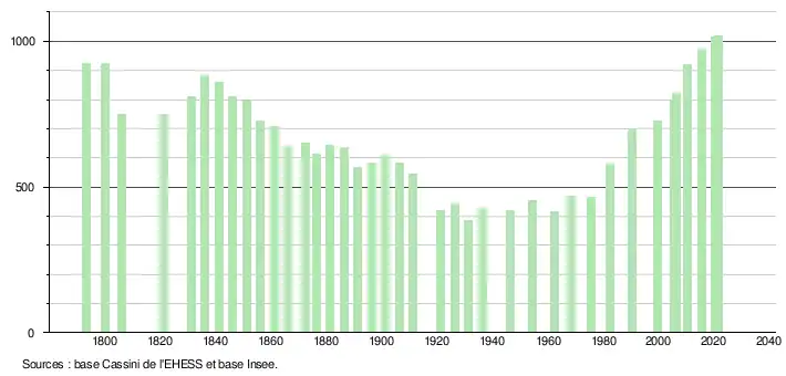 L'évolution du nombre d'habitants est connue à travers les recensements de la population effectués dans la commune depuis 1793. Pour les communes de moins de 10 000 habitants, une enquête de recensement portant sur toute la population est réalisée tous les cinq ans, les populations légales des années intermédiaires étant quant à elles estimées par interpolation ou extrapolation[23]. Pour la commune, le premier recensement exhaustif entrant dans le cadre du nouveau dispositif a été réalisé en 2005[24].