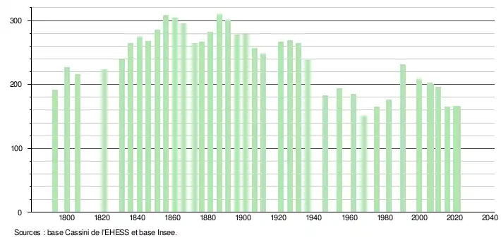 L'évolution du nombre d'habitants est connue à travers les recensements de la population effectués dans la commune depuis 1793. Pour les communes de moins de 10 000 habitants, une enquête de recensement portant sur toute la population est réalisée tous les cinq ans, les populations légales des années intermédiaires étant quant à elles estimées par interpolation ou extrapolation[20]. Pour la commune, le premier recensement exhaustif entrant dans le cadre du nouveau dispositif a été réalisé en 2005[21].
