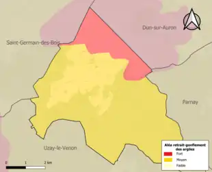 La commune est vulnérable au risque de mouvements de terrains constitué principalement du retrait-gonflement des sols argileux[15]. Cet aléa est susceptible d'engendrer des dommages importants aux bâtiments en cas d’alternance de périodes de sécheresse et de pluie. La totalité de la commune est en aléa moyen ou fort (90 % au niveau départemental et 48,5 % au niveau national). Sur les 14 bâtiments dénombrés sur la commune en 2019, 14 sont en aléa moyen ou fort, soit 100 %, à comparer aux 83 % au niveau départemental et 54 % au niveau national. Une cartographie de l'exposition du territoire national au retrait gonflement des sols argileux est disponible sur le site du BRGM[16],[Carte 2].