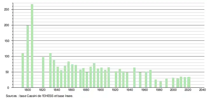L'évolution du nombre d'habitants est connue à travers les recensements de la population effectués dans la commune depuis 1793. Pour les communes de moins de 10 000 habitants, une enquête de recensement portant sur toute la population est réalisée tous les cinq ans, les populations légales des années intermédiaires étant quant à elles estimées par interpolation ou extrapolation[22]. Pour la commune, le premier recensement exhaustif entrant dans le cadre du nouveau dispositif a été réalisé en 2005[23].