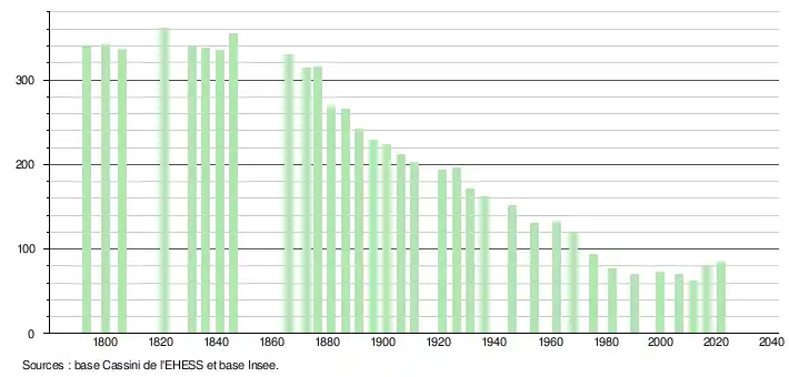 L'évolution du nombre d'habitants est connue à travers les recensements de la population effectués dans la commune depuis 1793. Pour les communes de moins de 10 000 habitants, une enquête de recensement portant sur toute la population est réalisée tous les cinq ans, les populations légales des années intermédiaires étant quant à elles estimées par interpolation ou extrapolation[16]. Pour la commune, le premier recensement exhaustif entrant dans le cadre du nouveau dispositif a été réalisé en 2006[17].