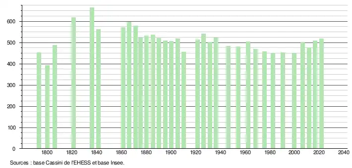 L'évolution du nombre d'habitants est connue à travers les recensements de la population effectués dans la commune depuis 1793. Pour les communes de moins de 10 000 habitants, une enquête de recensement portant sur toute la population est réalisée tous les cinq ans, les populations légales des années intermédiaires étant quant à elles estimées par interpolation ou extrapolation[23]. Pour la commune, le premier recensement exhaustif entrant dans le cadre du nouveau dispositif a été réalisé en 2006[24].