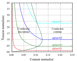 - le courant limite entre la conduction continue et discontinue est :. Par conséquent, la frontière entre conduction continue et discontinue est décrite par : .