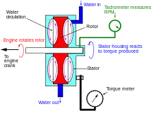 Pour les bancs d'essai où l'on a besoin de connaître le moment du couple d'un arbre, on utilise un peson monté sur une console liée au bâti du moteur, et perpendiculaire à la bielle d'entrée. Le carter de la turbine, ou stator, est monté sur des roulements à rouleaux, et l'arbre est lui-même monté sur des roulements à rouleaux faisant l'interface avec le stator afin qu'il puisse tourner indépendamment. Le peson se trouve entre le bâti et le stator de la turbine, qui a tendance à tourner en sens inverse de l'arbre de la turbine (troisième loi de Newton).