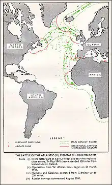Les Britanniques adoptèrent un système de convoi, à l'origine volontaire puis obligatoire, pour tous les navires marchands au début de la Seconde Guerre mondiale. Chaque convoi se composait de trente à soixante-dix navires marchands non armés[4]. Les ressources canadiennes et américaines étaient vitales pour l'effort de guerre britannique. La bataille de l'Atlantique était une lutte acharnée entre les Allemands, qui avaient développé d'importantes tactiques anti-convoi, et les Alliés, qui avaient développé des contre-tactiques visant à les repousser.