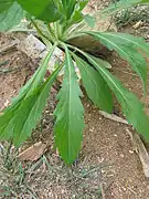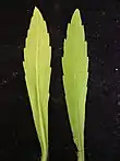 Les feuilles basales et inférieures sont disposées en rosette, entières, pétiolées, à limbe ovale elliptique denté, qui une fois flétries restent persistantes à l'anthèse. Les feuilles caulinaires inférieures et moyennes sont oblancéolées à lancéolées, de 4–10 cm de long, 0,5–1,5 cm de large, à apex aigu et base atténuée, bords généralement dentés en scie (serreté) . Les feuilles supérieures sont plus petites, linéaires à lancéolées, subentières, pubescentes sur les deux faces[10].