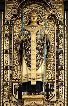 Statue de l'évêque Absalon sur la façade de l'hôtel de ville de Copenhague.