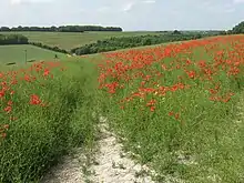 Les coquelicots figurent dans les œuvres de plusieurs peintres modernes. Par exemple : Gustave Courbet (Les Coquelicots[43]), Claude Monet (Champ de coquelicots, Champ d'avoine aux coquelicots[44] ), Vincent van Gogh (Champ aux coquelicots[45]) ou Gustav Klimt (Champ de coquelicots).
