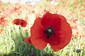 Le coquelicot a été associé, au XXe siècle, en particulier dans les pays du Commonwealth (Royaume-Uni, Canada, Australie, Nouvelle-Zélande…), au souvenir des combattants, et tout spécialement des soldats tombés lors de la Première Guerre mondiale[39], à l'instar du bleuet pour les combattants français. Cette allégorie du coquelicot découle d'un poème, écrit le 3 mai 1915 par le lieutenant-colonel John McCrae, un médecin du Corps de santé royal canadien qui fut témoin de la terrible seconde bataille d'Ypres[40]. Il s'intitule In Flanders Fields (Dans les champs de Flandres). En fait, les coquelicots fleurissaient sur le bord des tranchées et sur les tombes des soldats (phénomènes remarqués dès les guerres napoléoniennes)[41], et leur couleur rouge était un symbole approprié pour le bain de sang de la guerre de tranchées. En 1918, Moina Michael, universitaire membre de la YWCA, découvre ce poème et promeut l'usage des coquelicots comme symbole de mémoire. Cette pratique est adoptée par l'American Legion en 1920 lors d'un congrès auquel participe Anna E. Guerin, membre du YMCA en France, qui propose de vendre, à l'occasion de l'anniversaire de l'Armistice, des coquelicots en tissu faits à la main, afin de recueillir de l'argent pour les orphelins de guerre. En 1921, une délégation de veuves françaises rend visite au maréchal britannique Douglas Haig, fondateur de la Royal British Legion, et le convainc de vendre ces coquelicots pour amasser des fonds pour les anciens combattants blessés et au chômage[40]. Dès 1922, les divers pays qui ont adopté ce symbole entreprennent de fabriquer les coquelicots en papier chez eux. La tradition se poursuit depuis de vendre ces fleurs le jour du Souvenir[42].