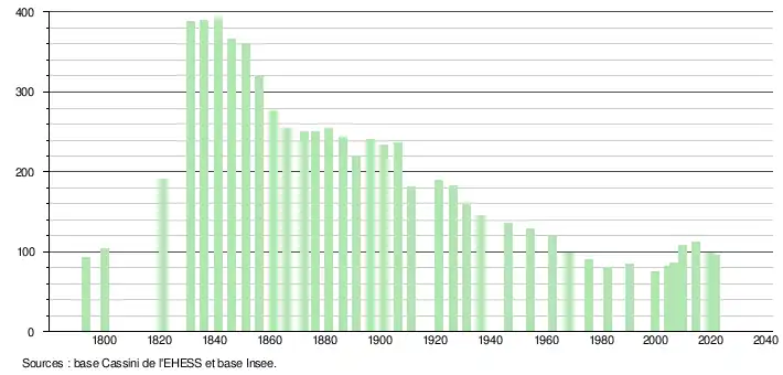 L'évolution du nombre d'habitants est connue à travers les recensements de la population effectués dans la commune depuis 1793. Pour les communes de moins de 10 000 habitants, une enquête de recensement portant sur toute la population est réalisée tous les cinq ans, les populations légales des années intermédiaires étant quant à elles estimées par interpolation ou extrapolation[40]. Pour la commune, le premier recensement exhaustif entrant dans le cadre du nouveau dispositif a été réalisé en 2004[41].