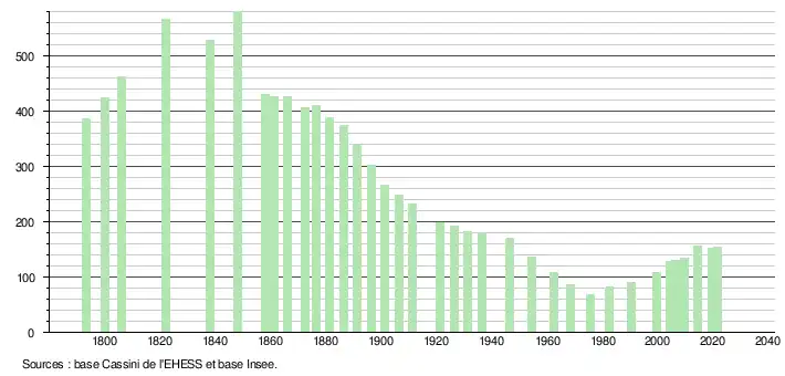 L'évolution du nombre d'habitants est connue à travers les recensements de la population effectués dans la commune depuis 1793. Pour les communes de moins de 10 000 habitants, une enquête de recensement portant sur toute la population est réalisée tous les cinq ans, les populations légales des années intermédiaires étant quant à elles estimées par interpolation ou extrapolation[17]. Pour la commune, le premier recensement exhaustif entrant dans le cadre du nouveau dispositif a été réalisé en 2004[18].