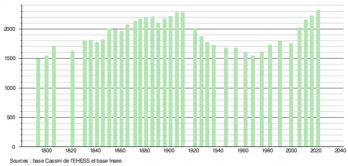 L'évolution du nombre d'habitants est connue à travers les recensements de la population effectués dans la commune depuis 1793. Pour les communes de moins de 10 000 habitants, une enquête de recensement portant sur toute la population est réalisée tous les cinq ans, les populations légales des années intermédiaires étant quant à elles estimées par interpolation ou extrapolation[21]. Pour la commune, le premier recensement exhaustif entrant dans le cadre du nouveau dispositif a été réalisé en 2006[22].