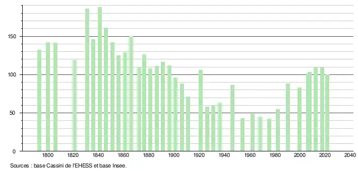 L'évolution du nombre d'habitants est connue à travers les recensements de la population effectués dans la commune depuis 1793. Pour les communes de moins de 10 000 habitants, une enquête de recensement portant sur toute la population est réalisée tous les cinq ans, les populations légales des années intermédiaires étant quant à elles estimées par interpolation ou extrapolation[17]. Pour la commune, le premier recensement exhaustif entrant dans le cadre du nouveau dispositif a été réalisé en 2007[18].