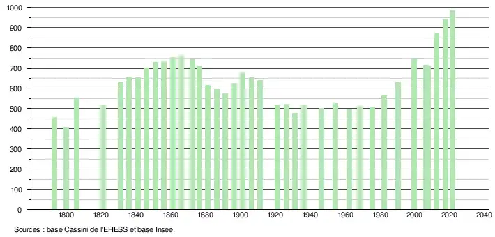 L'évolution du nombre d'habitants est connue à travers les recensements de la population effectués dans la commune depuis 1793. Pour les communes de moins de 10 000 habitants, une enquête de recensement portant sur toute la population est réalisée tous les cinq ans, les populations légales des années intermédiaires étant quant à elles estimées par interpolation ou extrapolation[17]. Pour la commune, le premier recensement exhaustif entrant dans le cadre du nouveau dispositif a été réalisé en 2007[18].