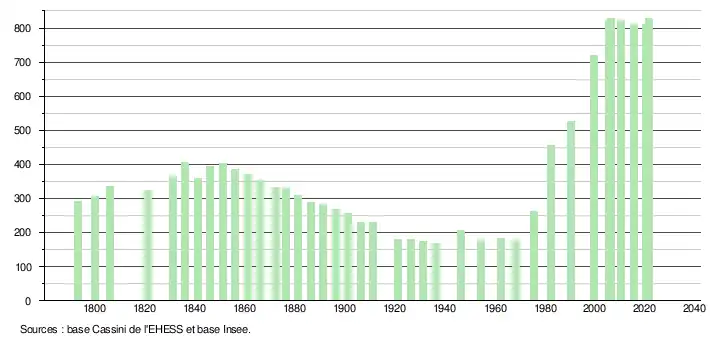 L'évolution du nombre d'habitants est connue à travers les recensements de la population effectués dans la commune depuis 1793. Pour les communes de moins de 10 000 habitants, une enquête de recensement portant sur toute la population est réalisée tous les cinq ans, les populations légales des années intermédiaires étant quant à elles estimées par interpolation ou extrapolation[15]. Pour la commune, le premier recensement exhaustif entrant dans le cadre du nouveau dispositif a été réalisé en 2005[16].