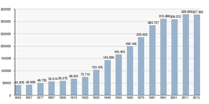 - Source: Population de fait selon l'Institut national de statistiques d'Espagne. Changements dans les communes lors des recensements de population depuis 1842, Chiffres de population des communes d'Espagne depuis 1996. Les données de 1787 proviennent du recensement de Floridablanca, disponible sur Population des communes d'Andalousie selon les recensements de 1787 à 2001. Junta de Andalucía. Le recensement de 1787 inclut aussi la population de l'ancienne commune de Trasierra ou Santa María de Trassierra (qui comptait 46 habitants en 1787) et annexée par la commune de Cordoue entre 1842 et 1857.