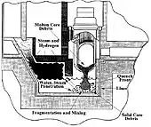 Si le corium en fond de cuve n'est pas suffisamment refroidi, il continue sa montée en température jusqu’à atteindre le point de fusion de la cuve, la percer et se répandre dans le bâtiment réacteur (c'est une rupture de la deuxième barrière de protection). L'enceinte de confinement joue alors seule le rôle de 3e barrière, les dispositifs de sauvegarde (aspersion, dispositif ultime U5) permettent d'en éviter la rupture.