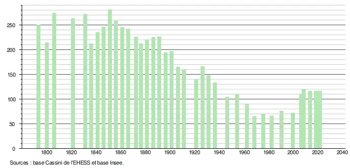 L'évolution du nombre d'habitants est connue à travers les recensements de la population effectués dans la commune depuis 1793. Pour les communes de moins de 10 000 habitants, une enquête de recensement portant sur toute la population est réalisée tous les cinq ans, les populations légales des années intermédiaires étant quant à elles estimées par interpolation ou extrapolation[22]. Pour la commune, le premier recensement exhaustif entrant dans le cadre du nouveau dispositif a été réalisé en 2008[23].