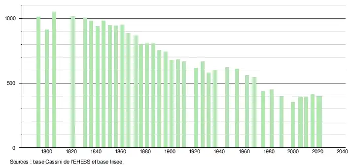 L'évolution du nombre d'habitants est connue à travers les recensements de la population effectués dans la commune depuis 1793. Pour les communes de moins de 10 000 habitants, une enquête de recensement portant sur toute la population est réalisée tous les cinq ans, les populations légales des années intermédiaires étant quant à elles estimées par interpolation ou extrapolation[23]. Pour la commune, le premier recensement exhaustif entrant dans le cadre du nouveau dispositif a été réalisé en 2005[24].