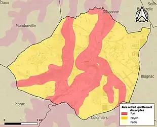 Le retrait-gonflement des sols argileux est susceptible d'engendrer des dommages importants aux bâtiments en cas d’alternance de périodes de sécheresse et de pluie. La totalité de la commune est en aléa moyen ou fort (88,8 % au niveau départemental et 48,5 % au niveau national). Sur les 2 125 bâtiments dénombrés sur la commune en 2019, 2 125 sont en aléa moyen ou fort, soit 100 %, à comparer aux 98 % au niveau départemental et 54 % au niveau national. Une cartographie de l'exposition du territoire national au retrait gonflement des sols argileux est disponible sur le site du BRGM[24],[Carte 3].