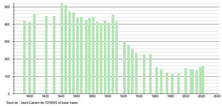 L'évolution du nombre d'habitants est connue à travers les recensements de la population effectués dans la commune depuis 1793. Pour les communes de moins de 10 000 habitants, une enquête de recensement portant sur toute la population est réalisée tous les cinq ans, les populations légales des années intermédiaires étant quant à elles estimées par interpolation ou extrapolation[28]. Pour la commune, le premier recensement exhaustif entrant dans le cadre du nouveau dispositif a été réalisé en 2008[29].