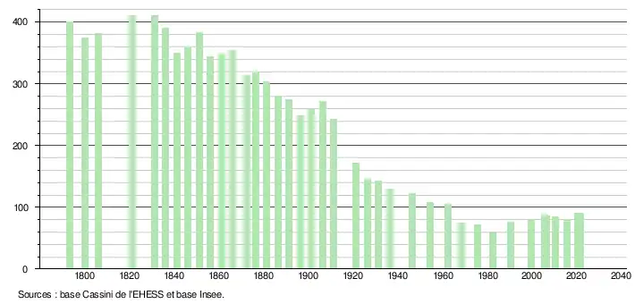 L'évolution du nombre d'habitants est connue à travers les recensements de la population effectués dans la commune depuis 1793. Pour les communes de moins de 10 000 habitants, une enquête de recensement portant sur toute la population est réalisée tous les cinq ans, les populations légales des années intermédiaires étant quant à elles estimées par interpolation ou extrapolation[21]. Pour la commune, le premier recensement exhaustif entrant dans le cadre du nouveau dispositif a été réalisé en 2005[22].