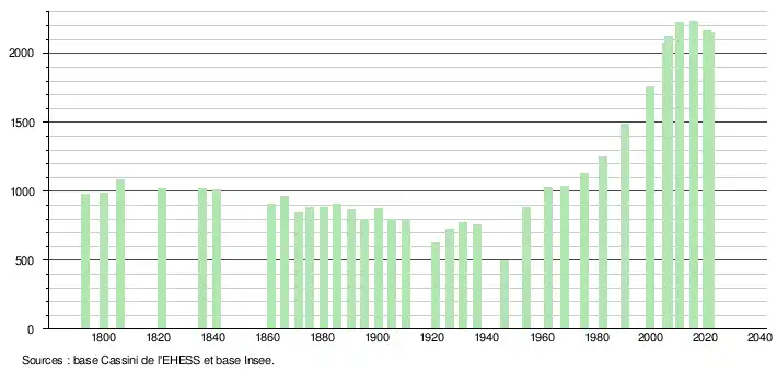 L'évolution du nombre d'habitants est connue à travers les recensements de la population effectués dans la commune depuis 1793. Pour les communes de moins de 10 000 habitants, une enquête de recensement portant sur toute la population est réalisée tous les cinq ans, les populations légales des années intermédiaires étant quant à elles estimées par interpolation ou extrapolation[32]. Pour la commune, le premier recensement exhaustif entrant dans le cadre du nouveau dispositif a été réalisé en 2005[33].