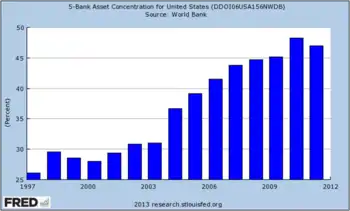 Le secteur bancaire est un exemple de cette concentration industrielle. Les cinq plus grandes banques américaines détenaient environ 30 % des actifs bancaires américains en 1998 ; cette proportion est passée à 45 % en 2008 et à 48 % en 2010, avant de retomber à 47 % en 2011[27].
