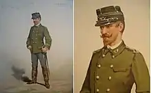 En 1875, les chasseurs forestiers existant officiellement, un pardessus confectionné en drap vert finance dans la forme adoptée pour les pardessus des officiers d'infanterie est défini[12], portant les mêmes boutons et insignes que ceux prescrits pour le veston-jacquette d'uniforme « pour MM. les agents forestiers qui seront désignés pour remplir des emplois d'officiers dans les compagnies de chasseurs forestiers ». Un texte[13] définit alors les insignes de grades du corps des chasseurs forestiers pour les emplois d'officiers au moyen de galons d'argent d'une largeur de 6 mm, façon dite en trait côtelé, placés autour du bas de chaque manche de vêtement et parallèlement à l'orifice, ainsi qu'autour du bandeau du képi, les rangs séparés entre eux par un intervalle de 4 mm, les tresses en argent placées sur les coutures verticales du turban simples pour les lieutenants et sous-lieutenants, doubles pour les capitaines, le nœud hongrois du calot formé d'un seul brin pour tous les grades :
