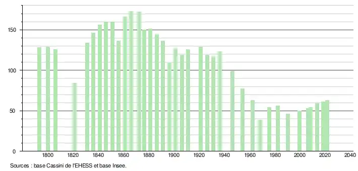 L'évolution du nombre d'habitants est connue à travers les recensements de la population effectués dans la commune depuis 1793. Pour les communes de moins de 10 000 habitants, une enquête de recensement portant sur toute la population est réalisée tous les cinq ans, les populations légales des années intermédiaires étant quant à elles estimées par interpolation ou extrapolation[18]. Pour la commune, le premier recensement exhaustif entrant dans le cadre du nouveau dispositif a été réalisé en 2008[19].