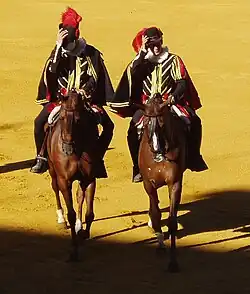 Viennent ensuite les monosabios, assistants des picadors, puis les areneros, employés des arènes qui ont pour fonction de remettre en état la piste entre deux taureaux.