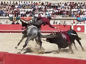 Le rôle du picador est, à l'aide de sa pique (lance en bois de hêtre de 2,60 mètres de long terminée par une pointe d'acier, la Puya), de piquer le taureau, ce qui permet d'évaluer sa bravoure[64]. « La pique a pour but de calmer le taureau par une saignée et de lui faire baisser la tête pour qu'il humilie dans la muleta (…), ceci en réduisant la force de son appareil musculaire »[64].