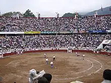 Les courses de taureaux telles qu’elles se pratiquaient alors en Espagne s’implantent en effet dans ses colonies d’Amérique. La première course de taureaux à Mexico, ordonnée par Hernán Cortés a eu lieu le , jour de la Saint-Hippolyte et anniversaire de la reddition de Tenochtitlán (nom aztèque de Mexico)[44] avec des taureaux importés d’Espagne. Au Mexique la corrida est interdite de 1867[45] jusqu'à 1887[46]. Le , alors que la corrida est bannie par cinq des trente-deux États mexicains, un tribunal prononce, « sur la base d’un article de la Constitution locale de Mexico qui garantit le « droit à un environnement sain » pour les animaux »[47], l’interdiction totale des spectacles taurins dans la capitale Mexico, ce qui entraine la fermeture de ses arènes[47], les plus grandes du monde avec 50 000 places[48].