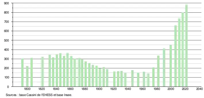 L'évolution du nombre d'habitants est connue à travers les recensements de la population effectués dans la commune depuis 1793. Pour les communes de moins de 10 000 habitants, une enquête de recensement portant sur toute la population est réalisée tous les cinq ans, les populations légales des années intermédiaires étant quant à elles estimées par interpolation ou extrapolation[29]. Pour la commune, le premier recensement exhaustif entrant dans le cadre du nouveau dispositif a été réalisé en 2006[30].
