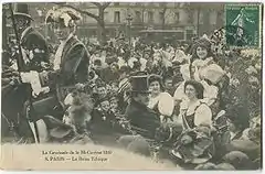 - Le cortège était divisé en quatre parties distinctes : après les cavaliers de la garde municipale qui ouvraient la marche, venaient les sociétés de tambours et clairons, trompettes, fanfares, la Méchéria, l'Union des trompettes du douzième, puis les chars de l'actualité de l'année. Nous passons ainsi une revue pittoresque : le char de la Pataudine, c'est-à-dire le citoyen Pataud avec ses grévistes des différentes corporations ; celui du pôle Nord, celui de la Mode, celui des Grands Chapeaux féminins, etc., etc. On applaudit au passage et l'on fait fête ensuite aux reines des comités et syndicats parisiens qui ont pris place dans douze landaus joliment fleuris attelés chacun de quatre chevaux blancs.