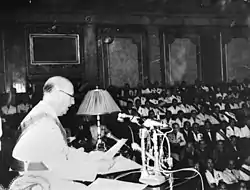 Le général Francisco Franco, revêtu de l’uniforme du Mouvement national, prononçant un discours devant les Cortes (probablement le 8 juillet 1964, à l’occasion de la séance inaugurale de la VIIIe Législature). À l’arrière-plan, les procurateurs, pareillement en uniforme. Dans les strapontins inférieurs, deuxièmes à partir du bas, trois évêques, également procurateurs, en représentation de l’Église catholique.