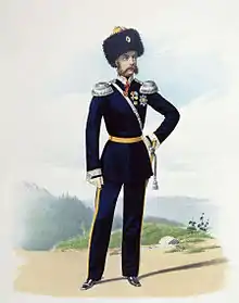 Les cosaques d’Astrakhan portent traditionnellement des pattes d’épaule, bandes de pantalon et des casquettes à bandeaux jaunes sur un uniforme bleu foncé[1].