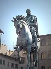 Cosme a su exploiter le rôle politique de l'art, en promouvant de nombreux chantiers qui ont changé le visage de Florence pour le mieux, afin de promouvoir une image de son gouvernement comme sage et éclairé, apportant un prestige économique et culturel à la ville. Une grande statue équestre de Cosme en bronze, par le sculpteur Jean Bologne, érigée en 1598[16], se dresse encore sur la Piazza della Signoria, la place principale de Florence. Une autre statue le représentant, est dressée à Pise sur la Piazza dei Cavalieri.