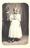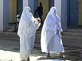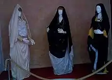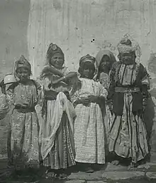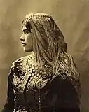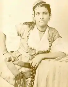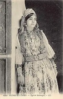 Toutefois, le costume des Constantinoises, semble plus statique que celui de la capitale. La chemise de dessous, avec ses manches enrichies de dentelles, la djoubba ou gandoura unie ou bicolore, la chéchia pointue et la majorité des composantes vestimentaires et des bijoux maintiennent leurs formes anciennes[55]. Seul le caftan fait exception puisqu'il s'allège et s'inspire du modèle algérois et devient la pièce la plus prestigieuse[57]. Les broderies apparaissent sur une panoplie de coiffes, voiles, voilettes, foulards, mouchoirs, écharpes et étoles[58]. Parmi les pièces brodées, le voile nuptial, appelé abrouq, conserve un statut privilégié, il est déposé sur la pointe de la chéchia conique qui est posée sur un fichu soyeux blanc, la meherma[58]. Cette chechia était inclinée et recouverte de sultanis ou de louis d'or[59].