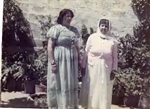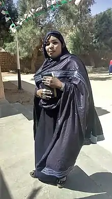 Toutefois, les femmes aurésiennes renoncent à certaines traditions ancestrales liées à l'habillement et à la parure. Dès l'aube du XXe siècle, elles optent pour les cotonnades et abandonnent les laines tissées héritées de l'ère antique[80]. La proximité de Constantine avait entraîné l'assimilation du principe du vêtement coupé et cousu par les villageoises vers la fin de l'époque ottomane[82]. En hiver, certaines femmes multiplient le nombre de robes de dessous (téjbibt) qu'elles recouvrent de l'épais manteau (tajdîd)[81], une grande pièce de tissage, presque carrée, parfois blanche[83]. Elles portent d'abord une chemise (qmedja) large et arrivant aux chevilles, munie d'amples manches, généralement de teinte foncée ou fleurie sur fond sombre, elle est de couleur claire lors des jours de fêtes[81].