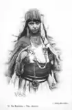 La ceinture, agous ou tisfifin demeure spécifique au costume kabyle, elle est façonnée à partir de plusieurs longues tresses de fils de laine aux coloris lumineux enroulées autour de la taille[98]. Elle retenait l'ampleur des vieux vêtements et reste essentielle au costume féminin kabyle[99]. Le burnous, vêtement essentiellement masculin, est exceptionnellement porté par les femmes de familles de marabouts lors des visites[100].