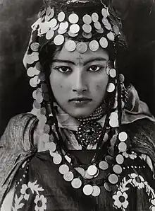 Difficile d'accès, le massif des Aurès se distingue par la permanence de formes vestimentaires et de parures vernaculaires peu impactées par les influences étrangères[80]. Ainsi, le péplum à fibules, appelé elhaf, perdure dans les villages de l'Aurès plus longtemps que dans les autres régions montagneuses de l'Algérie[80]. Si le costume aurassien peut subir diverses modifications selon la saison, l'âge, et le village où il est porté, ses traits généraux restent identiques dans tout le massif[81].