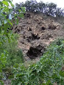 Il y a au-dessus du village une falaise faite d'une longue barre de tuf (80 m de haut, 400 m de long) aux multiples grottes[5] remplies d'énormes stalactites ; il y a aussi un aven nommé la salle des Merveilles de 50 m de profondeur et plus de 200 m de couloirs, une très grande salle aux concrétions d'un blanc éclatant. Plus loin se trouve le gouffre des Trompines[6], où se précipite l'eau de la source Saint-Martin.