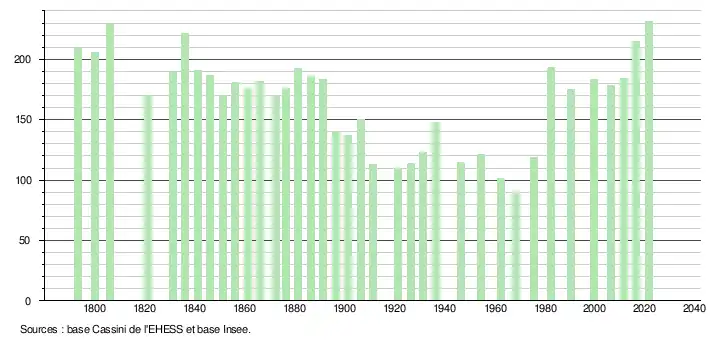 L'évolution du nombre d'habitants est connue à travers les recensements de la population effectués dans la commune depuis 1793. Pour les communes de moins de 10 000 habitants, une enquête de recensement portant sur toute la population est réalisée tous les cinq ans, les populations légales des années intermédiaires étant quant à elles estimées par interpolation ou extrapolation[22]. Pour la commune, le premier recensement exhaustif entrant dans le cadre du nouveau dispositif a été réalisé en 2006[23].