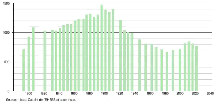L'évolution du nombre d'habitants est connue à travers les recensements de la population effectués dans la commune depuis 1793. Pour les communes de moins de 10 000 habitants, une enquête de recensement portant sur toute la population est réalisée tous les cinq ans, les populations légales des années intermédiaires étant quant à elles estimées par interpolation ou extrapolation[16]. Pour la commune, le premier recensement exhaustif entrant dans le cadre du nouveau dispositif a été réalisé en 2006[17].