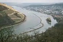 À la transition du Rhin Supérieur au Rhin moyen entre les villes de Mayence et Bingen, le Rhin qui a jusque-là une orientation est-sud-est se dirige vers l'ouest puis vers le nord-ouest. C'est ici que commence la cluse à travers le massif schisteux rhénan et se prolonge jusqu'à Coblence. Après Bingen apparaît un obstacle à la navigation, le « trou de Bingen » (Binger Loch) formé par un récif de quartzite. Le Rhin ne fait pas que changer de direction à cause de cette barrière naturelle, sa déclivité augmente aussi. Entre Mannheim et Bingen, il a une pente de 10 cm/km qui atteint 65 cm/km entre Bingen et Coblence.
