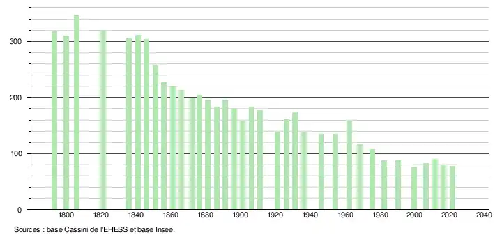 L'évolution du nombre d'habitants est connue à travers les recensements de la population effectués dans la commune depuis 1793. Pour les communes de moins de 10 000 habitants, une enquête de recensement portant sur toute la population est réalisée tous les cinq ans, les populations légales des années intermédiaires étant quant à elles estimées par interpolation ou extrapolation[23]. Pour la commune, le premier recensement exhaustif entrant dans le cadre du nouveau dispositif a été réalisé en 2006[24].