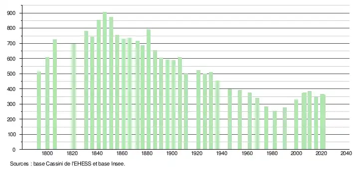 L'évolution du nombre d'habitants est connue à travers les recensements de la population effectués dans la commune depuis 1793. Pour les communes de moins de 10 000 habitants, une enquête de recensement portant sur toute la population est réalisée tous les cinq ans, les populations légales des années intermédiaires étant quant à elles estimées par interpolation ou extrapolation[21]. Pour la commune, le premier recensement exhaustif entrant dans le cadre du nouveau dispositif a été réalisé en 2005[22].